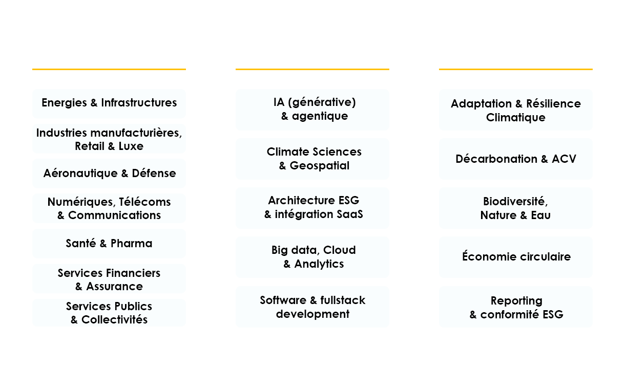 • Une expertise hybride de pointe associant conseil stratégique, maîtrise des enjeux ESG (Environnementaux, Sociaux et de Gouvernance) et déploiement d'outils technologiques à l'état de l'art, portés par un pragmatisme et une techno-lucidité sans faille.
