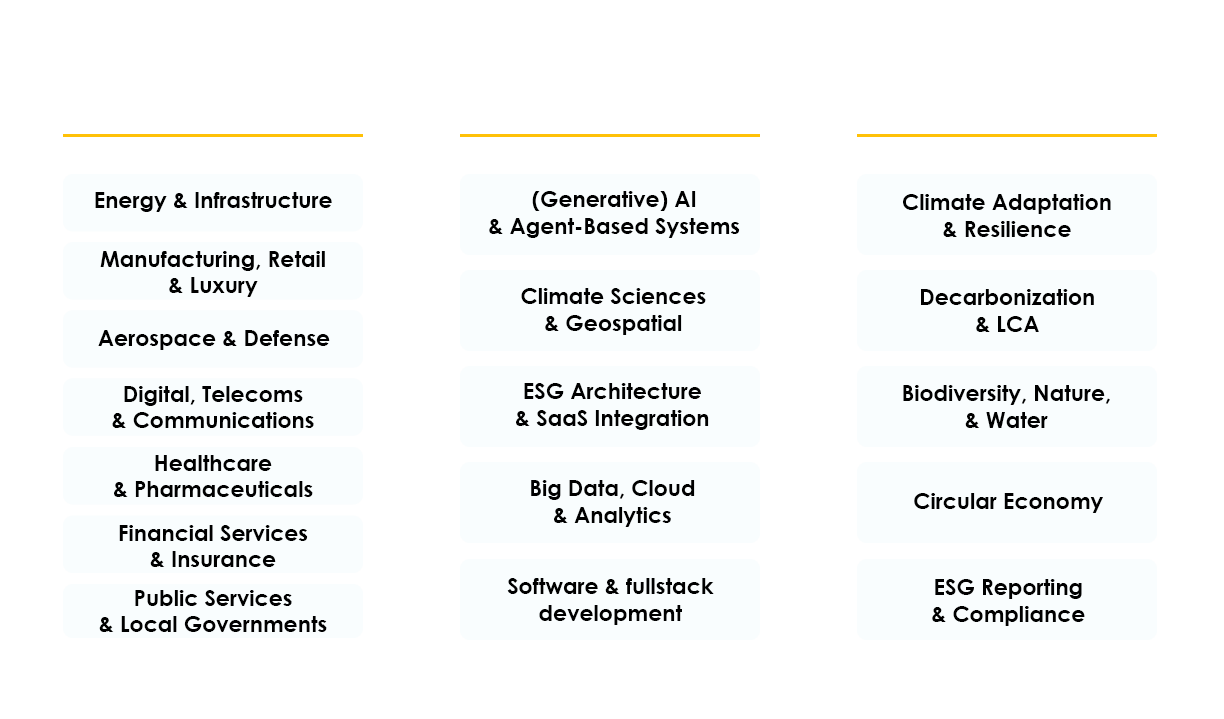 • Cutting-edge hybrid expertise combining strategic consulting, mastery of ESG (Environmental, Social, and Governance) issues, and the deployment of state-of-the-art technological tools, driven by unwavering pragmatism and technological acumen.